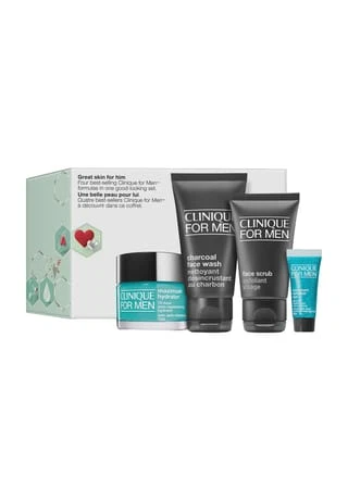 Die erfrischende Gel-Creme erhöht den Feuchtigkeitsgehalt der Haut im Handumdrehen und lang anhaltend, das federleichte Hydro-Filler Concentrate hydratisiert die sensible Haut der Augenpartie optimal. Das Face Wash bildet einen sanften Schaum, der Unreinheiten porentief entfernt, ohne die Haut auszutrocknen, das Peeling befreit die Haut von abgestorbenen Schüppchen und bereitet sie bestens auf die Rasur vor. Clinique vereint mit diesem Set vier Skincare-Highlights für ihn in einem Set, das sich hervorragend verschenken lässt.