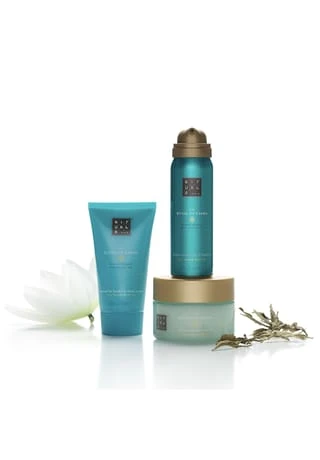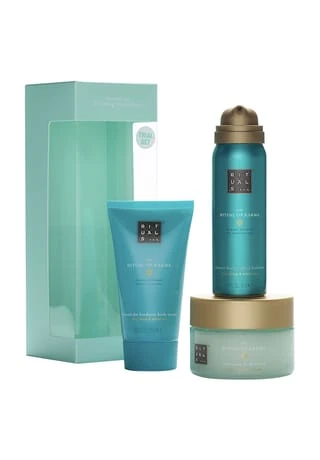 Das Set von The Ritual of Karma enthält einen Duschschaum, eine Körpercreme und ein Körperpeeling. (70ml + 125ml + 50ml)