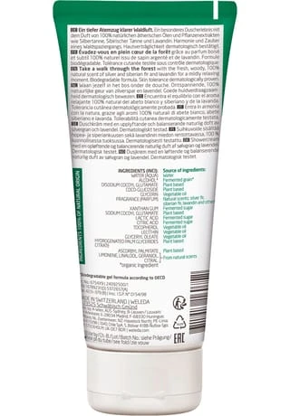 Erleben Sie die Harmonie des Waldes mit einem frisch-holzigen Duft mit Silbertanne, sibirischer Tanne und Lavandin. Ein tiefer Atemzug klarer Waldluft. Das leicht abzuspülende, biologisch abbaubare Aroma-Duschgel (gemäß OECD) bewahrt die Hautfeuchtigkeit. Mit milden Tensiden auf pflanzlicher Basis wird Ihre Haut sanft gereinigt. Wohlbefinden für Körper und Sinne! Mit 100 % natürlichen, ätherischen Ölen. Hautverträglichkeit dermatologisch bestätigt.